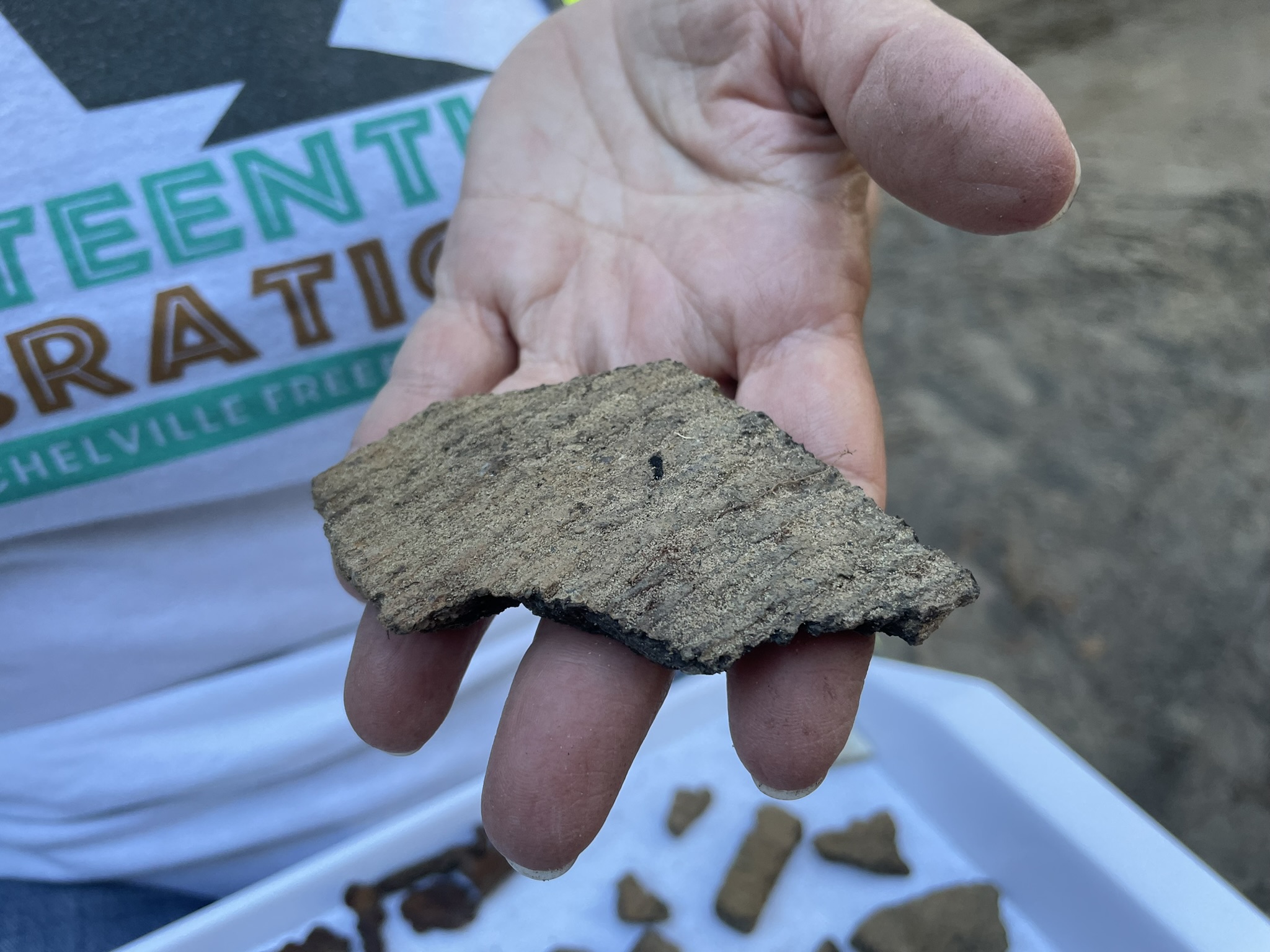 Archaeology Volunteer holding Native American ceramic sherd: During the construction of the Ghost Structure, archaeologists encountered many artifacts from the Indigenous people who used the park as their home long before Mitchelville.